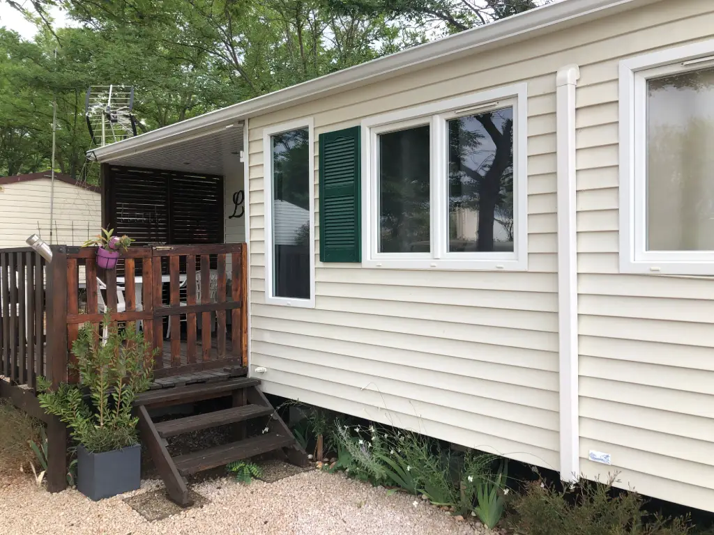 Le mobil home se compose d'une cuisine équipée (ustensiles inclus) ouverte sur le séjour (1 couchage) et sur la terrasse, d'une machine à laver, d'une chambre avec lit double et d'une chambre avec deux lits simples, salle de douche et WC séparés.